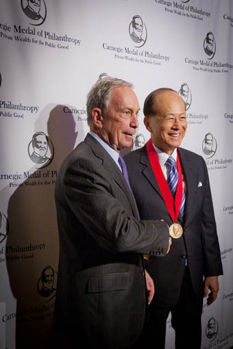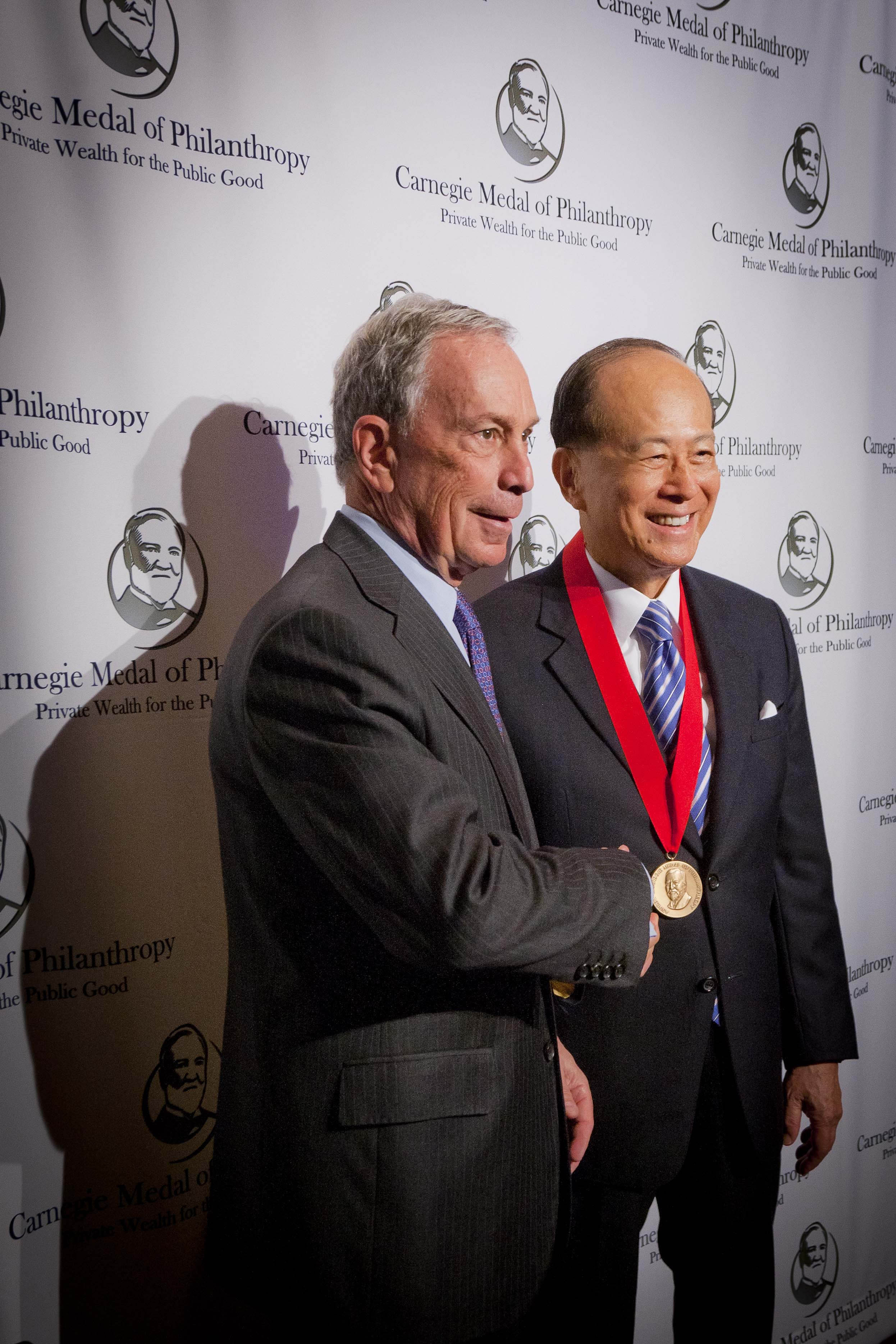 | 2. New York City Mayor and former Carnegie Medal of Philanthropy recipient Michael Bloomberg congratulates Mr Li Ka-shing on receiving the award. |