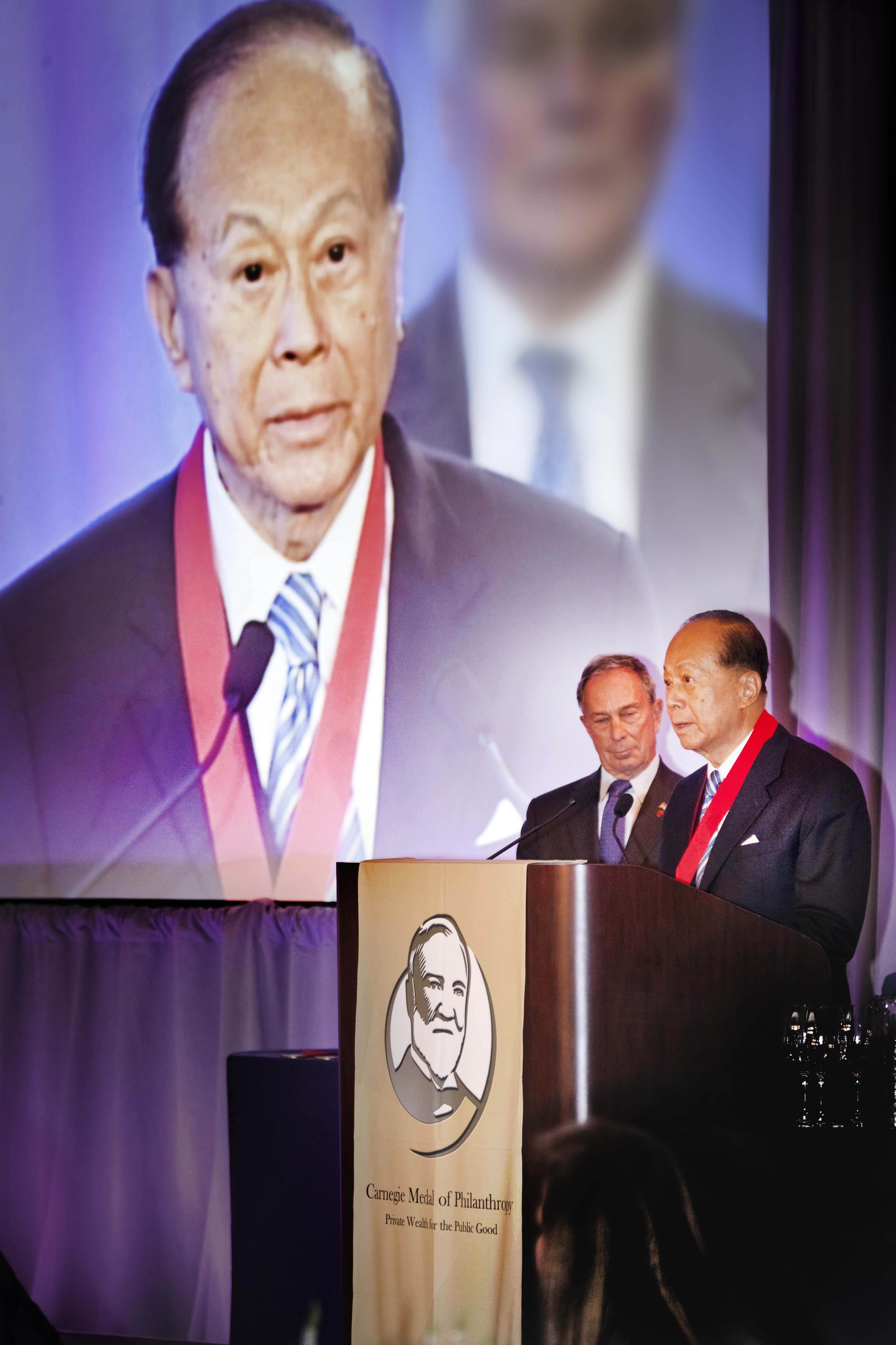 | 4. The Carnegie Corporation honours Mr Li Ka-shing with the Carnegie Medal of Philanthropy in a ceremony at the New York Public Library, 20 October 2011. Mr Li receives the medal along with a bronze bust of Andrew Carnegie. |