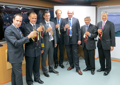 | 香港國際貨櫃碼頭董事總經理嚴磊輝 (右一)、達飛輪船公司行政總裁魯道夫‧沙迪(左三)及一眾高級行政人員於首次靠泊在香港國際貨櫃碼頭的全球最大貨櫃船「達飛‧馬可波羅」上合照。 |